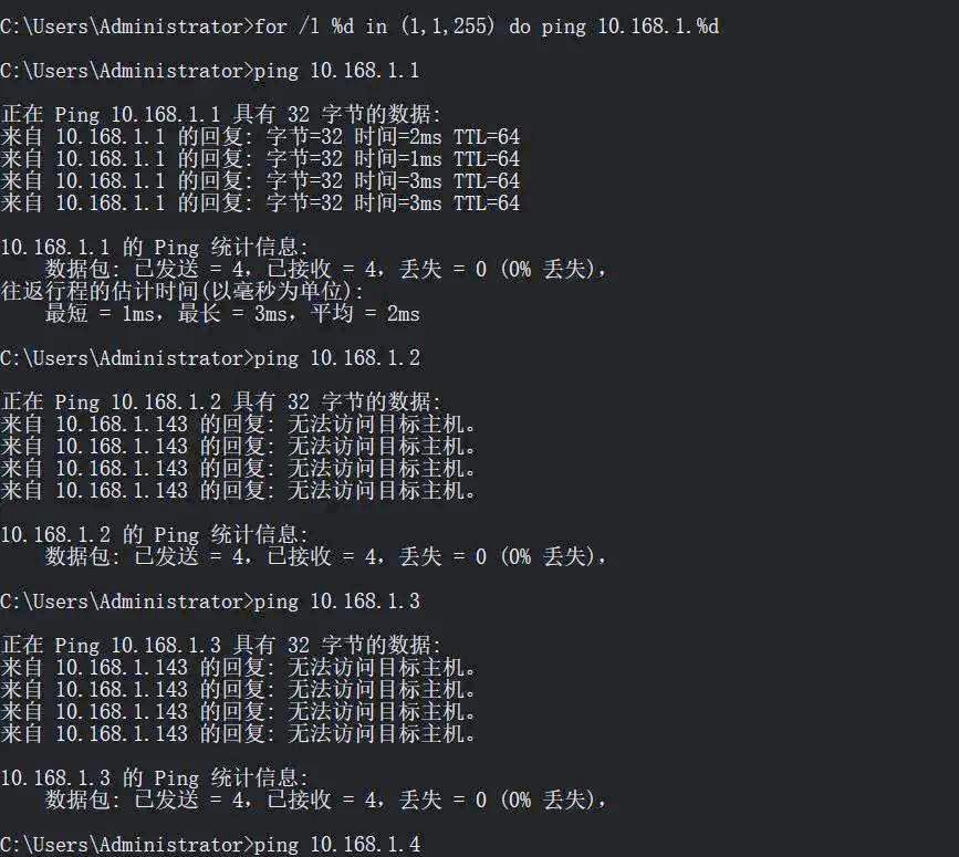 當輸入批量ping命令后,該命令會自動對網(wǎng)段內(nèi)的所有IP地址進行逐一測試,直至檢測完畢。在代碼中,(1,1,255)指定了網(wǎng)段的起始和結束范圍,即從192.168.1.1到192.168.1.255,每次遞增1個IP地址,共計檢測255個IP。若發(fā)現(xiàn)某些IP地址無法ping通,則可能是網(wǎng)絡設備存在問題,需要進一步檢查。